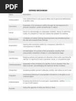 Level I - pathological defences (i.e. psychotic denial, delusional projection) Level II - immature defences (i.e. fantasy, projection, passive aggression, acting out) Level III - neurotic defences (i.e. intellectualization, reaction formation, dissociation, displacement, repression) Level IV - mature defences (i.e. humour, sublimation, suppression, altruism, anticipation)