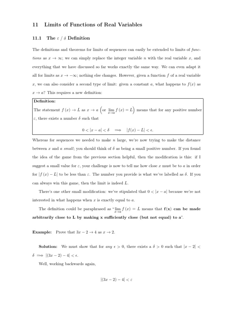 Whereas for sequences we needed to make n large, were now trying to make the distance between x and a small ; you should think of as being a small positive number. If you found the idea of the game from the previous section helpful, then the modication is this: if I suggest a small value for , your challenge is now to tell me how close x must be to a in order for |f (x) L| to be less than . The number you provide is what weve labelled as . If you can always win this game, then the limit is indeed L. Theres one other small modication: weve stipulated that 0 < |x a| because were not interested in what happens when x is exactly equal to a. The denition could be paraphrased as lim f (x) = L means that f (x) can be made arbitrarily close to L by making x suciently close (but not equal) to a. Example: Prove that 3x 2 4 as x 2. Solution: We must show that for any > 0, there exists a > 0 such that |x 2| < = |(3x 2) 4| < . Well, working backwards again,