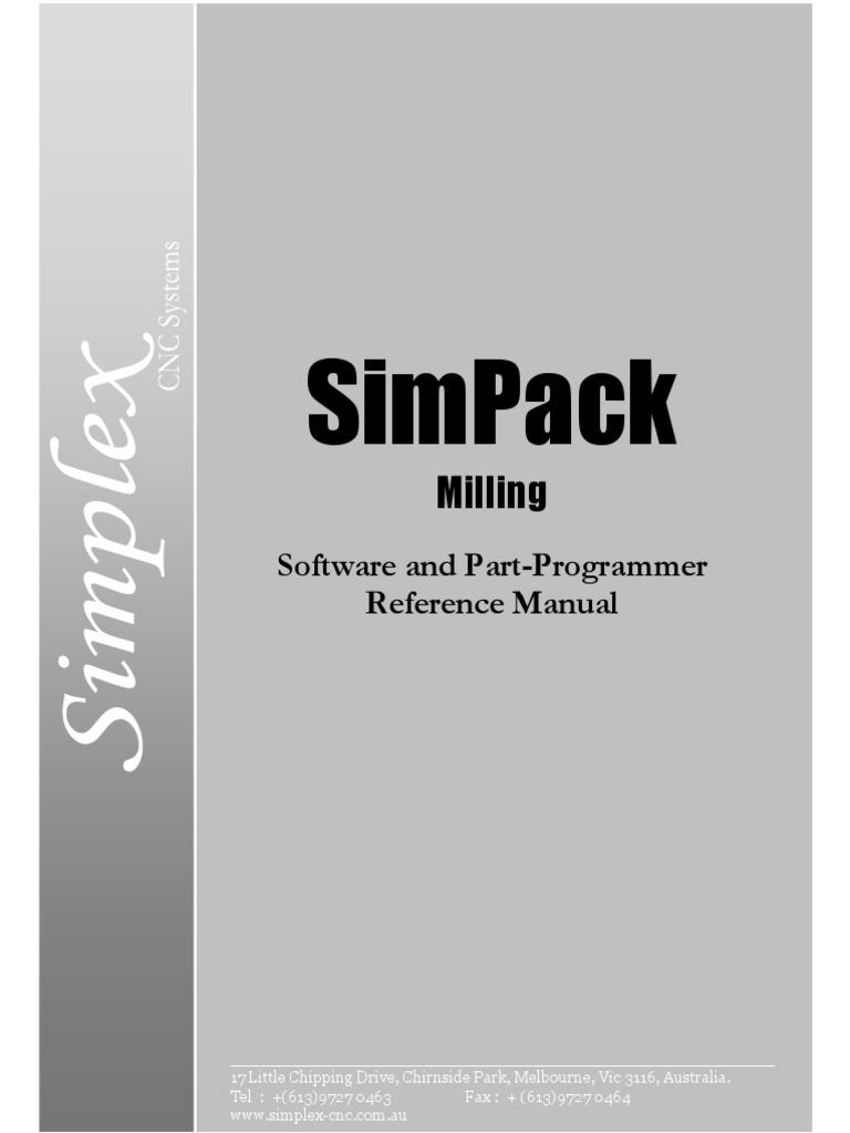 2000 CNC Systems Pty Ltd. All rights reserved. This manual may be updated from time-to-time due to product improvements, etc., and may not conform in every respect to former issues. To report errors or inconsistencies, call or email: Phone : (613) 9727 0463 Fax : (613)9727-0464 Email : support@simplex-cnc.com.au Website: www.simplex-cnc.com.au