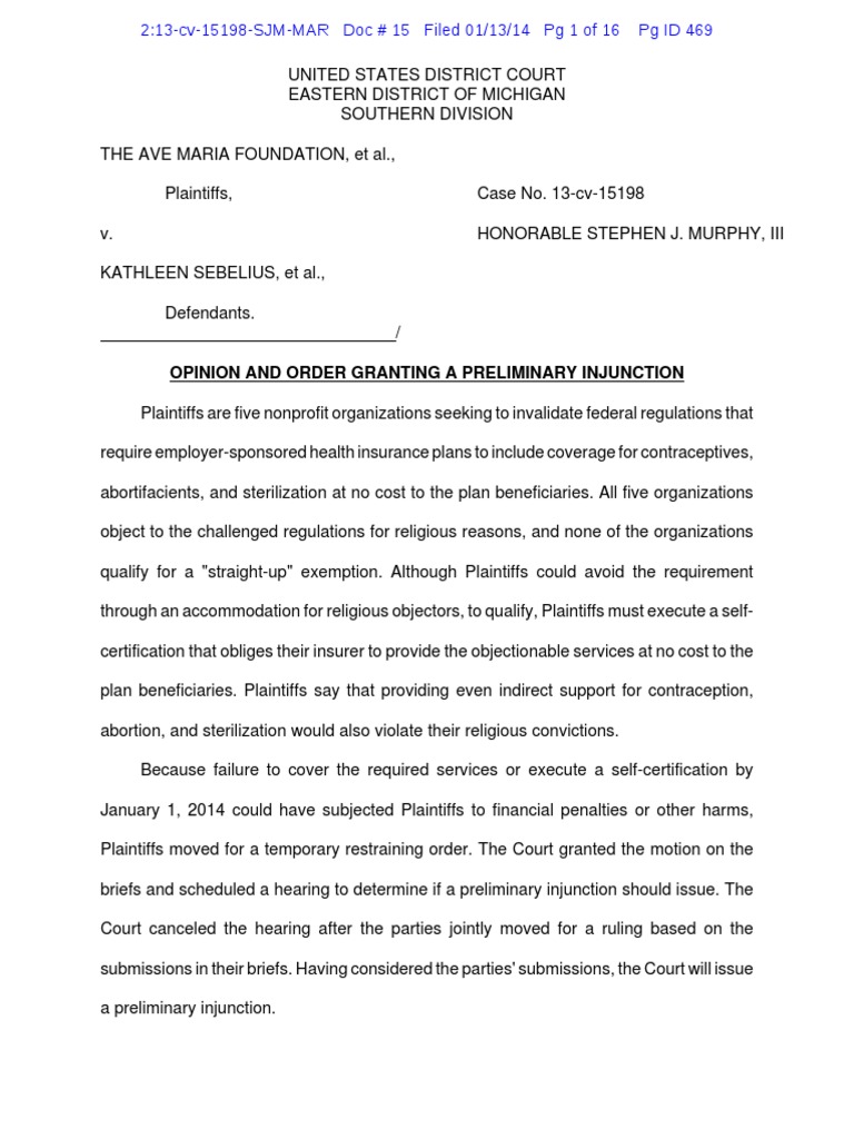 The Rhondora J. Donahue Academy, Inc., is a religious primary school grounded in the traditions of the Roman Catholic Church. Monaghan Decl. 1820. It actively professes belief in the authoritative teachings of the Catholic Church, including those related to sexual activity. Gurnsey Decl. 8, ECF No. 3-6. Ave Maria Communications produces Catholic radio programming and promotes Catholic teaching through a variety of media sources. Monaghan Decl. 2122; Kresta Decl. 5, ECF No. 3-5. It too actively professes belief in the authoritative teachings of the Catholic Church, including those related to sexual activity. Kresta Decl. 7. The Thomas More Law Center is a public interest law firm dedicated to education and litigation on issues of human life, religious freedom, and traditional family values. Monaghan Decl. 25. And Dominos Farms Petting Farm is a nonprofit that promotes understanding of an agriculture lifestyle and operate[s] an animal petting farm for educational purposes. Monaghan Decl. 27. All five organizations maintain a group health insurance plan through Blue Cross/Blue Shield of Michigan. Zumda Decl. 5, ECF No. 3-4. Plaintiffs believe that providing health insurance is necessary to remain competitive employers and fulfills their religious duty to provide for the health and well-being of [their] employees and their families. Monaghan Decl. 49, 52; see also Zumda Decl. 18; Kresta Decl. 20; Guernsey Decl. 21. But for religious reasons, Plaintiffs health plan exclude coverage for abortion, abortifacients, sterilization, and artificial contraception. Monaghan Decl. 3133; Zumda Decl. 1213. Notwithstanding the HRSA Mandate, Plaintiffs desire to continue providing health plans insurance coverage that excludes payments for abortions, sterilizations, and abortifacient and contraceptive drugs. Zumda, Decl. 17. But Plaintiffs' existing health plan is ineligible for grandfathered status due to changes in cost-sharing. Zumda Decl. 89.