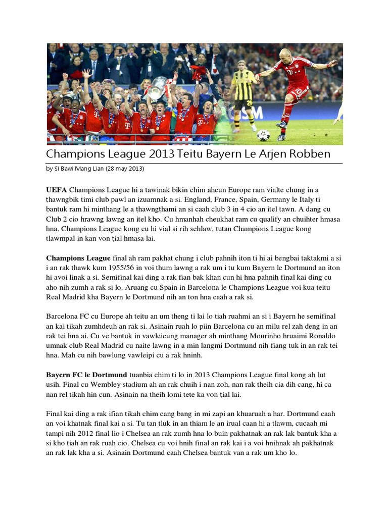 Hi final kong ah zumhnak a rak idang cio, asinain rak chimchung le ruahchung ning bantuk a rak si lo deng. Acheu nih Bayern nih tamtuk in a tei lai an ti, i acheu nih Dortmund nih a tei lai an rak ti ve. An chuih tak tikah kap hnih leiin lam tampi an rak onh, kol an rak sut veve. An rak itluk ngaingai i zoh zong an rak nuam, nain Arjen Robben nih teinak kol a sut in cun zumh deuh mi Bayern cu 2013 Europe siangpahrang ah an cang. Liverpool he UEFA champion an tei an i tluk, voi 5 veve an tei. Arjen Robben nih a kol hlan ah Mandzuki nih Bayern caah kol a sut hmasa. Cu hnu ah Dortmund nih penalty in an rak cham hna hnu ah teinak kol a simi cu Bayern alaikal nih minute a dih laite taktak ah a sut caah amah cu hero taktak a si. Cucaah amah kong hi tlawmpal in ka von ial. Bawlung a chuih i a tlik ah, nu a lo an ti heo. Amah hi Netherlands a si i 1984 ah a rak chuak. Bayern i a chuih hlan ah FC Groningen, PSV Eindhoven, Chelsea le Real Madrid ah a rak chuih. Netherlands aiawh in ram caah a chuih fawn. A chan chung ah teinak tampi a hmu nain a biapi tukmi caan pawl ah tampi a rak tla. Ahlei in a luancia kum thum hrawng ah a rak tla tuk. 2010 World Cup final le Champions League final ah a rak sung. 2010 World Cup ah khan Netherlands cu an rak zumh tuk hna bantuk in Final ah Spain he an rak itong. Robben nih hmai ah bawlung itlik pi in Spain kolbawh he lawng an si ko nain a rak kol lo. Cu tan ah voi tam nawn caan rem cu a rak ngei hiam ko. Asinain minute 116 a si ah an sung. Ni kum Champions League final ah a rak chuih balnak Chelsea le Bayern final an kai i penalty a nganh. Mah cun Chelsea nih an voi khatnak Champions League an rak tei i ahlei in Bayern ah hmunhma a rak ngei lo tuk i a chuih caan a rak tlawm hlei i penalty nganh cu a poi tuk. Mah cu lawng a si lo, 2007 lio Chelsea ah a um lio ah Champions League semifinal an rak kai han. Penalty chuih a rak si i Robben nih a rak nganh, i Chelsea cu an rak tla beh. Cu hnu ah Real Madrid ah an rak zuar kha a si. Cu a si caah tutan teinak ahhin amah Robben nakin ai lawm le a aumi an um lai lo, tiah ruah a si. Kum tampi ka zatlaknak vialte mah hi kol sinah an liam dih, tiah a chim ve. Puai chung vialte Dortmund hnukham pawl a tuaitam khawh hna. Caan a dih lai minute 2 ai duh ah a kol kha a si fawn tikah a mak ko. Asinain Robben caah Bayern ah hmun um ti dawh a si ti lo. Bayern manager thar Pep Guardiola nih Robben cu zuar a duh kong a fiang cang. Robben hi Chelsea ah kir han ding a fiang bik, nain amah caah club minthang tampi nih innka an on ko.