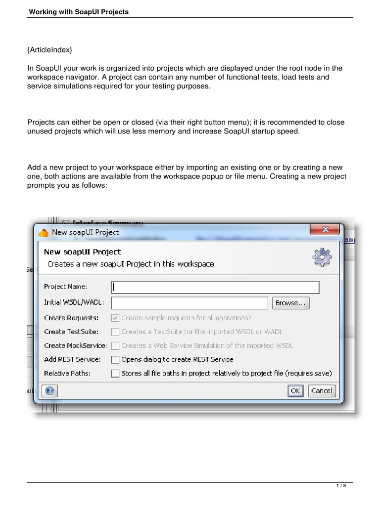 The the can specification be Overview used to tab enrich of shown a project your above project; description, gives some project-level general data properties on allowing the and contained several project event and scripts allows that initiate Load some Script session Called specific after data, the endpoints, project has been loaded. This can be to for example cleanup Save tasks, for example before removing the passwords project is being or test saved, items, etc. you to perform custom Report Script when generating aetc Project Report as described at The other tabs are related to specific functionalities in SoapUI and will be used covered elsewhere: TestSuites shows all functional TestSuites the Project (see http://www.soapui.org/Fu ) SOAP-bases Security Web Configurations Service (see manages project-level WS-Security configurations for curity.html http://www.soapui.org/SOAP-and-WSDL/applying-ws-se ) in Requirements called manages project requirements (see Projects/managing-requirements.html http://www.soapui.org/Working-with) multiple JDBC scenarios Connections (see manages project level connections that can be used inaspects ml http://www.soapui.org/Working-with-Projects/jdbc-connections.ht ) Reporting manages both global and project-level report templates and parameters (see http://www.soapui.org/Reporting/reporting-infrastructure.html )nctional-Testing/structuring-and-running-tests.html of test Events execution manages (see project-level event-handlers that can be used to(see enhance most html http://www.soapui.org/Scripting-Properties/custom-event-handlers. ) properties - of sets Environments SOAP and REST manages services, project-level environments and JDBC database for connections easy switching between different soapui.org/Functional-Testing/environment-handling-in-soapui.html http://www. )