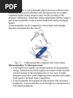 7 Microcode versus VLIW and RISC 1. Overview The elements composing a microprogram exist on a lower conceptual level than a normal application program. Each element is differentiated by the "micro" prefix to avoid confusion: microinstruction, microassembler, microprogrammer, microarchitecture, etc. The microcode usually does not reside in the main memory, but in a special high speed memory, called the control store. It might be either read-only or read-write memory. In the latter case the microcode would be loaded into the control store from some other storage medium as part of the initialization of the CPU, and it could be altered to correct bugs in the instruction set, or to implement new machine instructions. Microprograms consist of series of microinstructions. These microinstructions control the CPU at a very fundamental level of hardware circuitry. For example, a single typical microinstruction might specify the following operations: Connect Register 1 to the "A" side of the ALU Connect Register 7 to the "B" side of the ALU Set the ALU to perform two's-complement addition Set the ALU's carry input to zero Store the result value in Register 8 Update the "condition codes" with the ALU status flags ("Negative", "Zero", "Overflow", and "Carry") Microjump to MicroPC nnn for the next microinstruction To simultaneously control all processor's features in one cycle, the microinstruction is often wider than 50 bits, e.g., 128 bits on a 360/85 with an emulator feature. Microprograms are carefully designed and optimized for the fastest possible execution, since a slow microprogram would yield a slow machine instruction which would in turn cause all programs using that instruction to be slow. 2. The reason for microprogramming Microcode was originally developed as a simpler method of developing the control logic for a computer. Initially CPU instruction sets were "hardwired". Each step needed to fetch, decode and execute the machine instructions (including any operand address calculations, reads and writes) was controlled directly by combinatorial logic and rather minimal sequential state machine circuitry. While very efficient, the need for powerful instruction sets with multi-step addressing and complex operations (see below) made such "hard-wired" processors difficult to design and debug; highly encoded and varied-length instructions can contribute to this as well, especially when very irregular encodings are used. Microcode simplified the job by allowing much of the processor's behaviour and programming model to be defined via microprogram routines rather than by dedicated circuitry. Even late in the