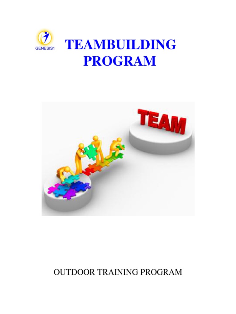METHODOLOGY The primary methodology of choice of GENESIS1 shall be Adventure Learning Programs and/or Structured Learning Exercises, (also known as Experiential Learning). These methodologies provide an avenue for fun-filled, stress-free learnings as the participants are taken out of the work environment and are thus more open to realizing the Learning Agendas. The core competency of GENESIS1 as an organization is the ability to process the Learning Agendas contained in the various activities and apply such to the work environment in a fun-filled method with teachings that will be easy to recall and apply. LEVEL 1 PROGRAM: The Level 1 Program of GENESIS1 aims to lay down the foundations of teammanship and unity for the client company. The program consists of 5 to 7 Adventure Learning Programs in the day (known as Activity Modules) covering roughly about an hour each with separate processing per Activity Module. The Level 1 Program is expository in nature and will bring out ones true self especially as all guards are down when the teambuilding takes place. The focus of the Level 1 Program is on the learning as we emphasize that it is not about winning, it is n ot about losing; it is about learning. SAMPLE PROGRAM SCHEDULE FOR 20 PARTICIPANTS DATE / TIME 8:30 9:00 AM 9:00 11:30 AM 11:30 12:30 PM 12:30 2:00 PM 2:00 3:00 PM 3:00 4:00 PM 4:00 5:00 PM 5:00 5:30 PM ACTIVITY Opening Remarks Orientation Personality Profiling On Board Lunch Communicate REMARKS Function Room Knowing Yourself & Your Colleagues Alternative Thinking Paradigm Shift Logic vs Emotions Importance of Proper Feedback Strategy & Persistence Adjusting to Difficulties Strategy, Communication & Coordination