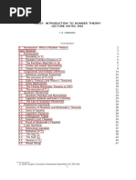 1.1. The Study of Structures. As many of you might know, number theory is the study of integers. This is a good starting point, but what do we mean by "study"? It is certainly NOT enough to just know what all the integers are. Otherwise, the course would be over before it starts... Rather, we try to understand the structures among the integers. Here are some most important examples of structures: (1) Arithmetic, algebraic structures: one can do addition and multiplication of integers, and still get an integer; the negative of an integer is still an integer, while the reciprocal of an integer is not an integer (unless for 1). 0 + n = n, 1 n = n. Associativity, commutativity laws for addition and multiplication... (2) Distance: one has the usual absolute value . One can say whether a and b are "close" to each other. One also has the p-adic absolute value p : if n = pm q , where q is relatively prime to p, then n p = (1 p)m ; roughly, it measures how divisible" n is, by the prime number p. (3) Order: one can say an integer is larger (or smaller) than another integer. In particular, every set of positive integers contains a smallest element. It turns out that these structures, which we are so familiar with ever since elementary school, can lead to results about integers which are totally non-obvious and even very deep. In establishing these results, mathematicians have developed very usual languges/formalisms/auxiliary tools, which in return have broadened the scope of mathematics itself. In the next section, well list some of those results. They should give you a avor about what kind of information mathematicians quest for in the study of number theory. eg. Other structures you might have seen before: topological structure: characterizes shapes of spaces, eg. how many holes a closed surface has, whether a space is compact, connected etc. (MAT-147, MAT-215) geometric structure: gives measurement of angles and distances. (MAT141, MAT-240) dierentiable structure: allows people to do calculus on certain kind of spaces. (MAT-125, MAT-239) complex structure: talks about complex dierentiable functions on spaces. (MAT-185, MAT-205) 1.2. What is Number Theory about? In this section, lets take a quick glimpse on some of the important topics in number theory. The purpose of this section is only to give you a avor of what number theory is about. We will certainly not