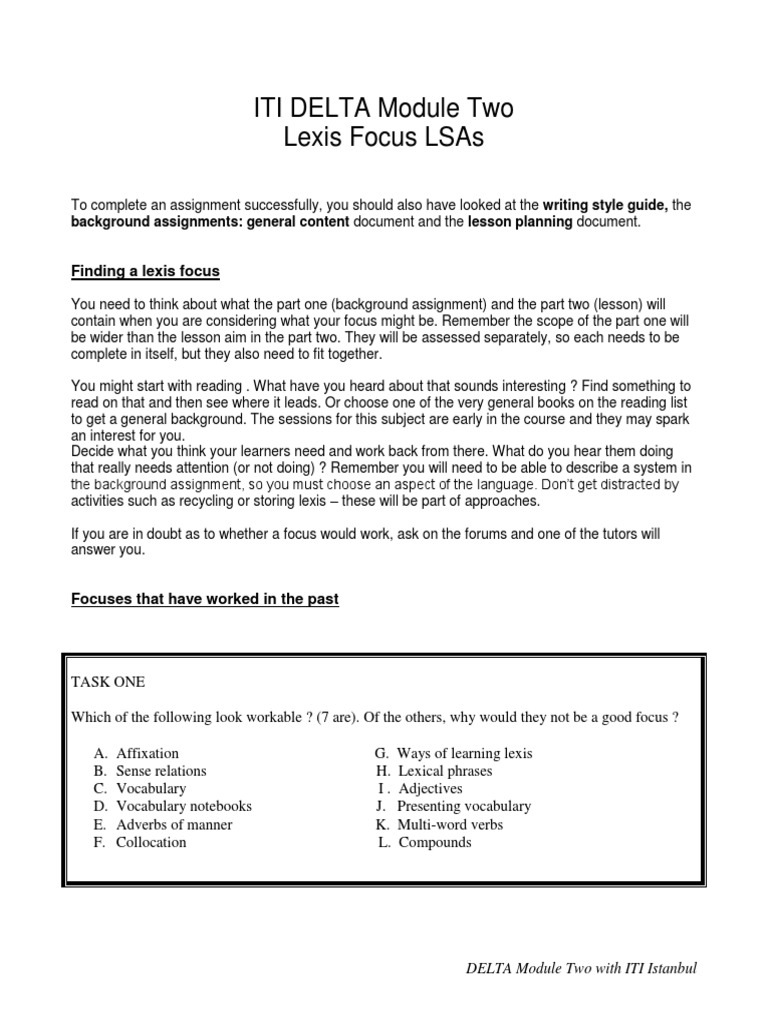 Task One Answer Key A. This usually works well as a focus, though some people get really into it and have to cut it down to just prefixes or suffixes. B. This can work well, you should restrict it to just a couple of sense relations (antonymy etc) as there really are quite s lot out there. C. This will not work as it is really only another way of saying lexis and thus you will not have narrowed your focus. This is a problem because it means you dont meet criteria 2 a and b and in any case it leaves a subject far too big to be covered at all adequately. D. This will not work. It is not about the language system of lexis, it is about ways of helping learners learn lexis and as such could be mentioned in approaches, but should not be an assignment focus. E. This can work well. F. Collocation can work well, though be careful to define what you understand and wish to focus on at the beginning. You will need to choose some areas, not try to cover all of it. G. This subject does not work. Again, it is part of approaches, not a suitable main focus. H. This can work well, though it is a big area and some people find it easier to restrict it in some way. I. This is too big you need to narrow further and as with many of the systems focuses, that s probably best done through an area rather than a level. J. This is another one that is part of approaches, not a suitable main focus. K. This works well. L. This works well.