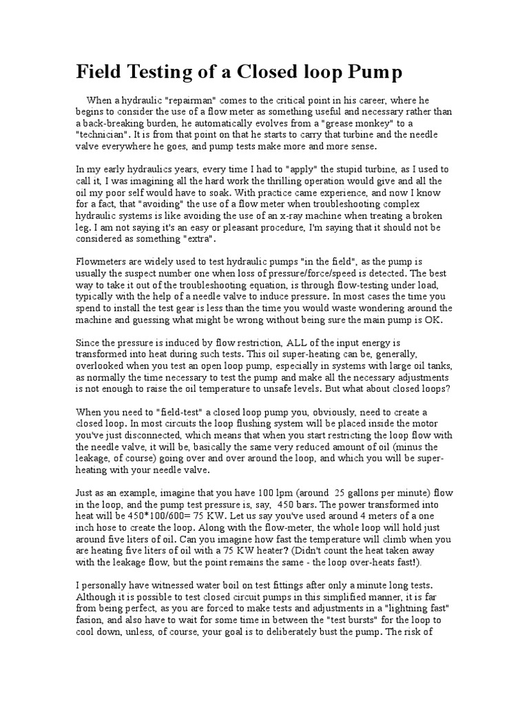 !he best course of action for closed loop pump field testing is to use a calibrated pressure compensated flow controller, connected after the needle valve, that diverts controlled part of the loop oil to tank +schematics ,. !here are two main advantages in this layout9 First one, of course, is the fact that the oil will not overheat so fast, allowing you to make more extensive tests and ad(ustments. !he second advantage is less obvious9