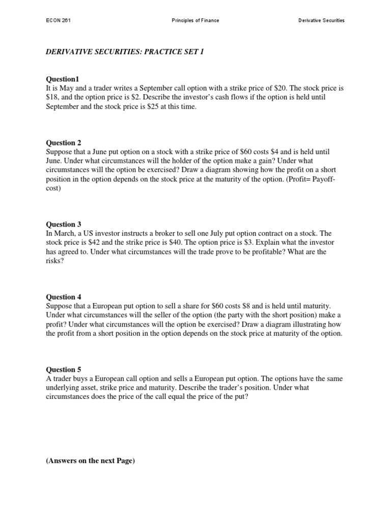 DERIVATIVE SECURITIES: PRACTICE SET 1