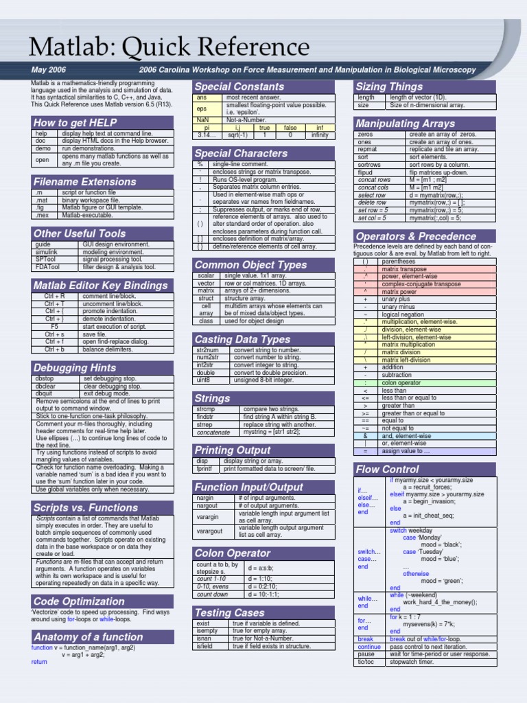 Matlab is a mathematics-friendly programming language used in the analysis and simulation of data. It has syntactical similarities to C, C++, and Java. This Quick Reference uses Matlab version 6.5 (R13).