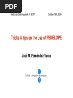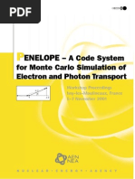 penelope_2003_NEA.pdf Official release by the OECD Nuclear Energy Agency Data Bank of the PENELOPE documentation, distributed together with version 2003. This is the reference to be used in any publication. Cite it as: F. Salvat, J.M. Fernndez-Varea and J. Sempau, PENELOPE - A Code System for Monte Carlo Simulation of Electron and Photon Transport (OECD Nuclear Energy Agency, Issy-les-Moulineaux, France, 2003). The subdirectories shown contain: \fsource \ FORTRAN 77 source files of the PENELOPE code system. Includes the transport/physics routines (penelope.f) , the quadric geometry package (pengeom.f), variance-reduction routines (penvared.f), the main program to create cross-section data files (material.f) and a program to generate tables of material interaction properties (tables.f). Files necessary for creating cross-section data (to be used together with material.exe and shower.exe ). Additional software for geometry visualization (\gview\), display of particle tracks (\shower\), plotting (scripts for the plotting program GNUPLOT in subdirectory \plotter\), and a routine package for including static electromagnetic fields (\emfields \). Three examples of user codes are included (penslab, pendoses and pencyl) together with two material data files (al.mat and naial.mat 1 ) and a clock subroutine (timer.f, notimer.f).