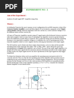 4. What is the gain at this point? 5. Bias VIN for maximum gain and measure the input impedance of the amplier. 6. Apply a 10mV amplitude, 1kHz sine wave at the input and plot the output on the oscilloscope. Because of the huge gain, the output waveform could be clipped. Attach a 100k load resistor at the output (which should remove the clipping at the output) and measure the peak-to-peak voltage across it. Using the gain you found from the sweep and the voltage across the load, nd the output impedance. 7. How do the impedances and gain compare with a common emitter biased with a resistor? 8. Now let's check out the temperature eects. (a) Apply a small signal sine wave vin in with an amplitude of 10mV at 1kHz . View the output waveform on the oscilloscope. (b) CAUTION: First check that the transistors are not hot before doing this. Heat up only one of the transistors in the current mirror by putting your nger on the transistor. Observe the eect on the output waveform. (c) Now put the other transistor in the current mirror between your other two ngers, thus heating both transistors up, and watch the eect on the output waveform. (d) Explain your observations using what you know about BJT temperature eects. How can this be an advantage of BJT biasing over resistive biasing (as shown in the prelab)?