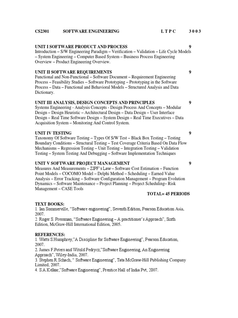 UNIT IV TESTING 9 Taxonomy Of Software Testing Types Of S/W Test Black Box Testing Testing Boundary Conditions Structural Testing Test Coverage Criteria Based On Data Flow Mechanisms Regression Testing Unit Testing Integration Testing Validation Testing System Testing And Debugging Software Implementation Techniques UNIT V SOFTWARE PROJECT MANAGEMENT 9 Measures And Measurements ZIPFs Law Software Cost Estimation Function Point Models COCOMO Model Delphi Method Scheduling Earned Value Analysis Error Tracking Software Configuration Management Program Evolution Dynamics Software Maintenance Project Planning Project Scheduling Risk Management CASE Tools TOTAL= 45 PERIODS TEXT BOOKS: 1. Ian Sommerville, Software engineering, Seventh Edition, Pearson Education Asia, 2007. 2. Roger S. Pressman, Software Engineering A practitioners Approach, Sixth Edition, McGraw-Hill International Edition, 2005. REFERENCES: 1. Watts S.Humphrey,A Discipline for Software Engineering, Pearson Education, 2007. 2. James F.Peters and Witold Pedrycz,Software Engineering, An Engineering Approach, Wiley-India, 2007. 3. Stephen R.Schach, Software Engineering, Tata McGraw-Hill Publishing Company Limited, 2007. 4. S.A.Kelkar,Software Engineering, Prentice Hall of India Pvt, 2007.