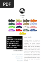 Crocs is a footwear company founded in 2002 by three sailors and solidified by their business partner, Ronald Snyder who later became the CEO. Throu h a series of business initiati!es, Crocs was able to o from bein sold in small !enues to bein in hu e outlets all throu hout the world. "y focusin on their product attributes, supply chain acti!ities, customer needs, mar#et trends, and retailers, Crocs was able to deli!er a !ariety of consumers a $uality product $uic#ly with minimal strain. %owe!er, despite these superior ad!anta es, Crocs is now bein threatened by other industry ri!als for mar#et share. %ow should Crocs differentiate its products to pre!ent itself from bein o!erta#en& %ow should Crocs le!era e its competencies in production, mar#etin , inbound lo istics, and infrastructure to come out ahead of their ri!als& "y constantly watchin and ad'ustin to mar#et trends, impro!in and le!era in its supply chain competencies, addin !alue, and by spreadin into new mar#ets and se ments, Crocs can ensure itself lon (term success in the footwear industry.