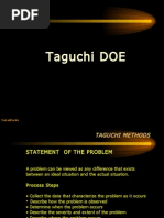 (3) TAGUCHI Method : -------------------------Dr. Taguchi of Nippon Telephones and Telegraph Company, Japan has developed a method based on " ORTHOGONAL ARRAY " experiments which gives much reduced " variance " for the experiment with " optimum settings " of control parameters. Thus the marriage of Design of Experiments with optimization of control parameters to obtain BEST results is achieved in the Taguchi Method. "Orthogonal Arrays" (OA) provide a set of well balanced (minimum) experiments and Dr. Taguchi's Signal-to-Noise ratios (S/N), which