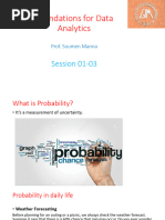 Probability Every point q in the sample space is true a certain proportion of the time, p(q), that we call the probability. Clearly, these probabilities cannot be 0. Also, the probabilities must sum 1 over the entire sample space. This is true since the sample space includes all possibilities, and thus the proportion of time that one of outcomes in the sample space occurs is 1. Uniform Sample Space This is a sample space in which all the outcomes have the same probability. Since they must sum to 1, the probability must be the reciprocal of the number of points in the sample space. In a uniform sample space of N outcomes, the probability of each outcome is 1/N. Event Probability The probability of event E, p(E), is the sum of p(q) over all the strings q in the subset corresponding to E. Expected Value _ The expected value of a random variable f, denoted as f or <f>, is the sum over all points q in the sample space of p(q)*f(q). This is the same as the mean or average of the variable. Notice that the expectation of an indicator variable for an event is the probability of that event. Expectation is a linear property of random variables. variables f and g, with constants a and b: Linearity of Random Variables <af +bg> = a<f> + b<g> Deviation The deviation of f from its mean value is f - <f>. Variance That is, for random