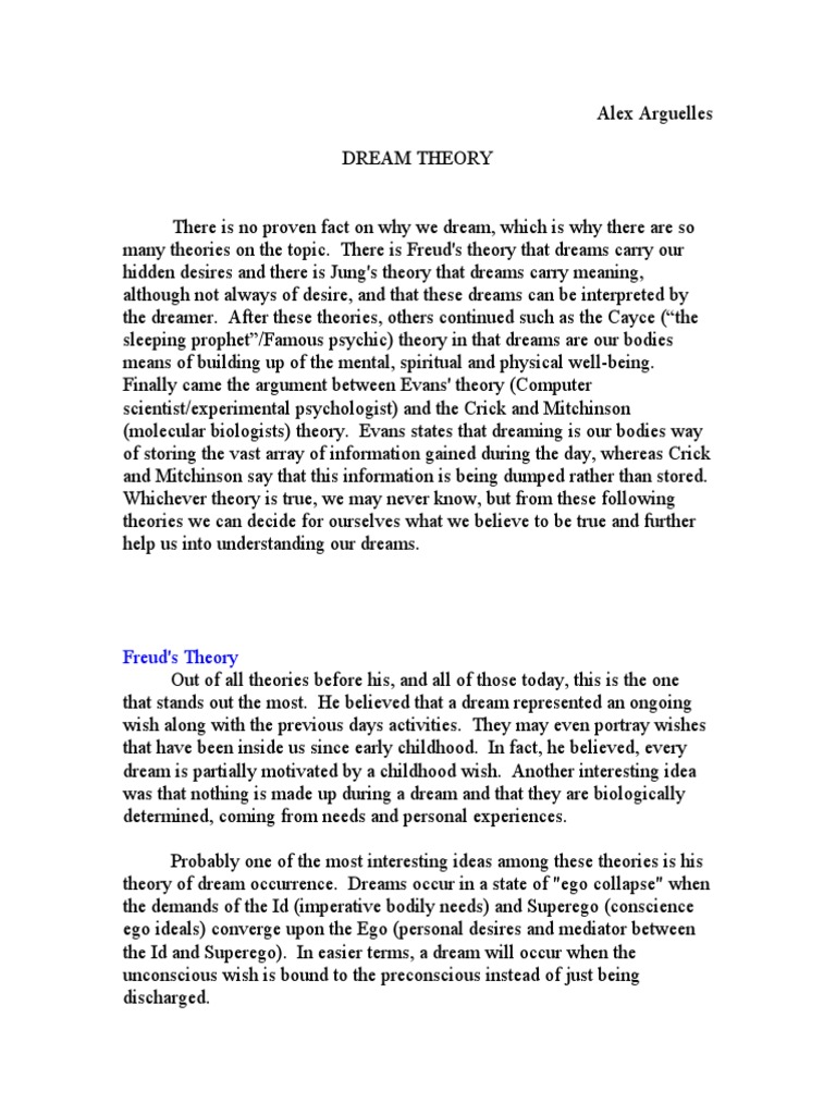 "reud#s Theory Out of all theories %efore his and all of those today this is the one that stands out the most! He %elieved that a dream represented an ongoing wish along with the previous days activities! They may even portray wishes that have %een inside us since early childhood! /n fact he %elieved every dream is partially motivated %y a childhood wish! Another interesting idea was that nothing is made up during a dream and that they are %iologically determined coming from needs and personal experiences! 0ro%a%ly one of the most interesting ideas among these theories is his theory of dream occurrence! Dreams occur in a state of 1ego collapse1 when the demands of the /d 'imperative %odily needs+ and 2uperego 'conscience ego ideals+ converge upon the Ego 'personal desires and mediator %etween the /d and 2uperego+! /n easier terms a dream will occur when the unconscious wish is %ound to the preconscious instead of 3ust %eing discharged!