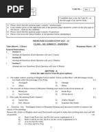 (a) the tendency for composing crowded scenes in*ol*ing too many forms and figures in the 8ughal miniature painting. (b) /he representation of the landscape background with typical deccani hills with deccan miniature painting. $. why do you like or dislike the paintings of the -engal school. ?i*e your appropriate . reasons in short. Q.%.0ighlight the aesthetic aspects of the famous painting /0.44 ?+.97 done by Amrita 7hergil. . Q.&. (a) 8ention the name of any three painters of the .a)asthani school included in your course of study, which you like the most. (b) 8ention the name of those two sub schools of the 3ahari miniatures which are included in your course of study Q.'. (a) 8ention the name of the 8ughal 4mperor6s period under whose patronage each of the following miniature painting was produced : # (i) @ahangir 0olding the picture of 8adona (ii) Aabir and .aidas. (iii) Arishna lifting 8ount ?o*erdhana (b) 8ention the name of the sub school of each of the following =eccani 8iniature paintings included in your course of study : (i) <hand -ibi playing polo. (ii) =ancers Q.( 8ention the names of any fi*e personalities who played important role in the formation of the -engal school. 2011/12 % . . #