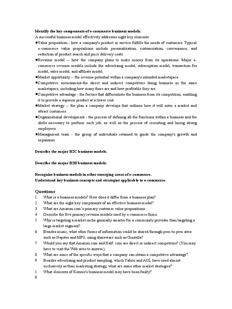 A successful business model effectively addresses eight key elements: Value proposition - how a company's product or service fulfills the needs of customers. Typical e-commerce value propositions include personalization customization convenience and reduction of product search and price delivery costs. !evenue model -- how the company plans to make money from its operations. "a#or ecommerce revenue models include the advertising model subscription model transaction fee model sales model and affiliate model. "arket opportunity -- the revenue potential within a company's intended marketspace. $ompetitive environment-the direct and indirect competitors doing business in the same marketspace including how many there are and how profitable they are. $ompetitive advantage - the factors that differentiate the business from its competition enabling it to provide a superior product at a lower cost. "arket strategy -- the plan a company develops that outlines how it will enter a market and attract customers. %rganizational development - the process of defining all the functions within a business and the skills necessary to perform each #ob as well as the process of recruiting and hiring strong employees. "anagement team - the group of individuals retained to guide the company's growth and e&pansion. Describe the major B2C business models. Describe the major B2B business models. Recognize business models in other emerging areas of e-commerce. nderstand key business concepts and strategies applicable to e-commerce.