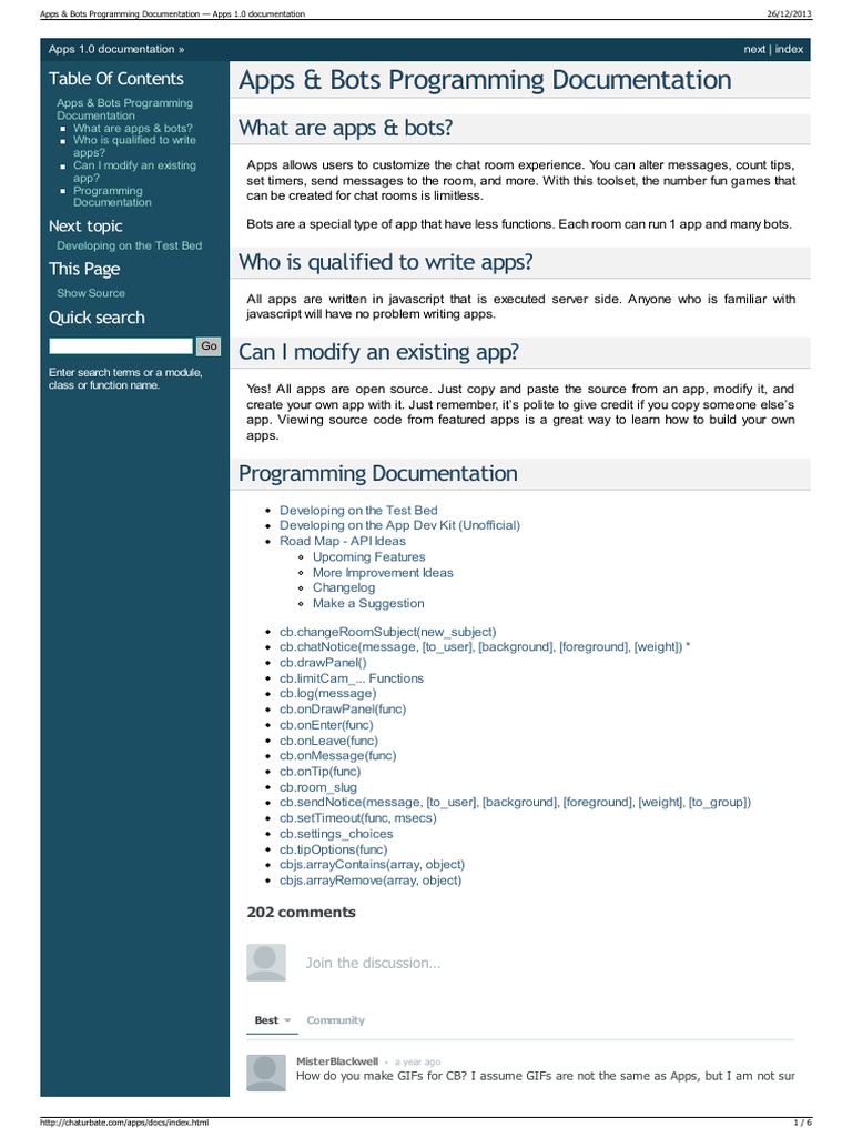 Developing on the Test Bed Developing on the App Dev Kit (Unofficial) Road Map - API Ideas Upcoming Features More Improvement Ideas Changelog Make a Suggestion cb.changeRoomSubject(new_subject) cb.chatNotice(message, [to_user], [background], [foreground], [weight]) * cb.drawPanel() cb.limitCam_... Functions cb.log(message) cb.onDrawPanel(func) cb.onEnter(func) cb.onLeave(func) cb.onMessage(func) cb.onTip(func) cb.room_slug cb.sendNotice(message, [to_user], [background], [foreground], [weight], [to_group]) cb.setTimeout(func, msecs) cb.settings_choices cb.tipOptions(func) cbjs.arrayContains(array, object) cbjs.arrayRemove(array, object)