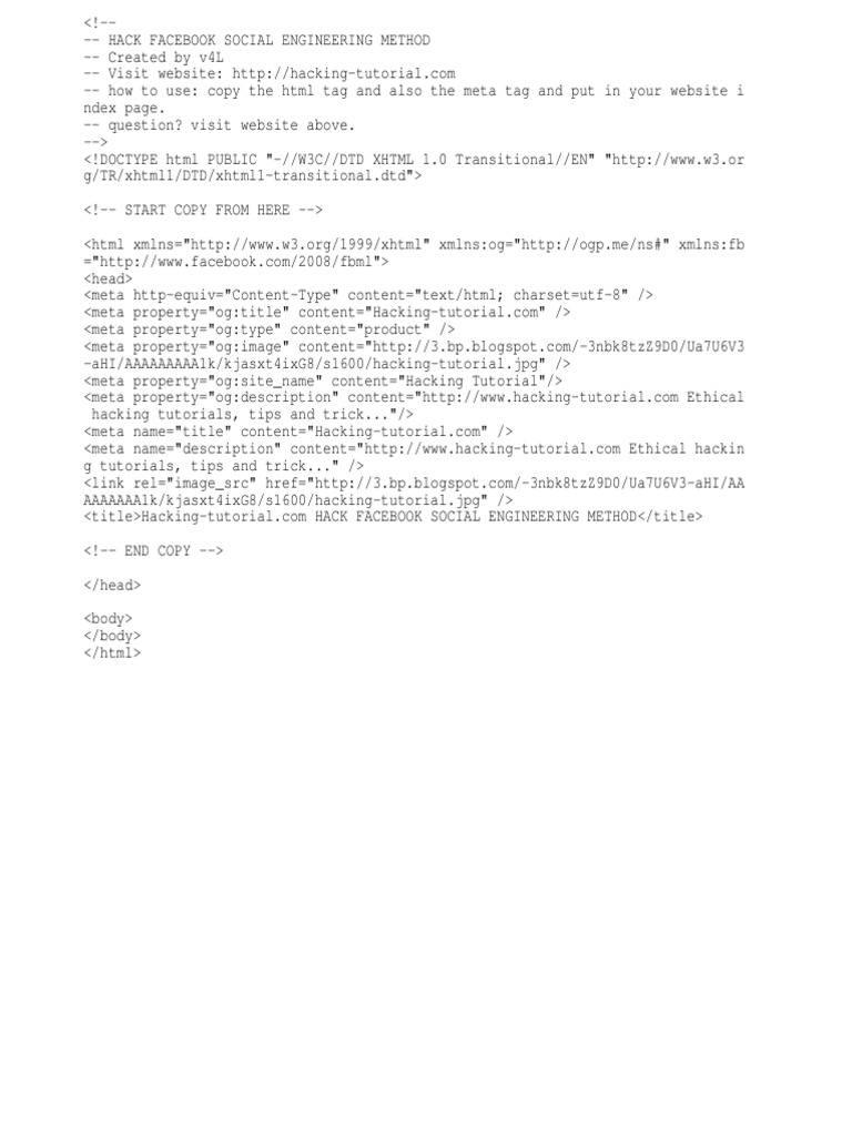 com -- how to use: copy the html tag and also the meta tag and put in your website i ndex page. -- question? visit website above. --> <!DOCTYPE html PUBLIC "-//W3C//DTD XHTML 1.0 Transitional//EN" "http://www.w3.or g/TR/xhtml1/DTD/xhtml1-transitional.dtd"> <!-- START COPY FROM HERE --> <html xmlns="http://www.w3.org/1999/xhtml" xmlns:og="http://ogp.me/ns#" xmlns:fb ="http://www.facebook.com/2008/fbml"> <head> <meta http-equiv="Content-Type" content="text/html; charset=utf-8" /> <meta property="og:title" content="Hacking-tutorial.com" /> <meta property="og:type" content="product" /> <meta property="og:image" content="http://3.bp.blogspot.com/-3nbk8tzZ9D0/Ua7U6V3 -aHI/AAAAAAAAA1k/kjasxt4ixG8/s1600/hacking-tutorial.jpg" /> <meta property="og:site_name" content="Hacking Tutorial"/> <meta property="og:description" content="http://www.hacking-tutorial.com Ethical hacking tutorials, tips and trick..."/> <meta name="title" content="Hacking-tutorial.com" /> <meta name="description" content="http://www.hacking-tutorial.com Ethical hackin g tutorials, tips and trick..." /> <link rel="image_src" href="http://3.bp.blogspot.com/-3nbk8tzZ9D0/Ua7U6V3-aHI/AA AAAAAAA1k/kjasxt4ixG8/s1600/hacking-tutorial.jpg" /> <title>Hacking-tutorial.com HACK FACEBOOK SOCIAL ENGINEERING METHOD</title> <!-- END COPY --> </head> <body> </body> </html>