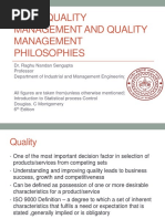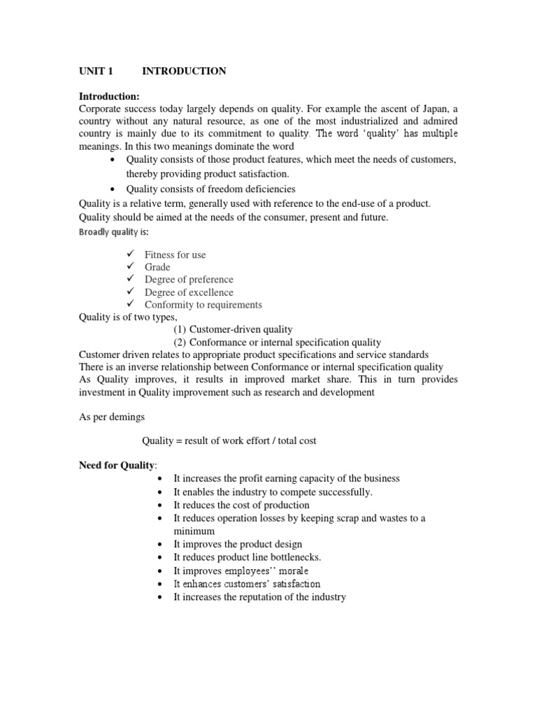 Fitness for use Grade Degree of preference Degree of excellence Conformity to requirements Quality is of two types, (1) Customer-driven quality (2) Conformance or internal specification quality Customer driven relates to appropriate product specifications and service standards There is an inverse relationship between Conformance or internal specification quality As Quality improves, it results in improved market share. This in turn provides investment in Quality improvement such as research and development As per demings Quality = result of work effort / total cost Need for Quality: It increases the profit earning capacity of the business It enables the industry to compete successfully. It reduces the cost of production It reduces operation losses by keeping scrap and wastes to a minimum It improves the product design It reduces product line bottlenecks. It improves employees morale It enhances customers satisfaction It increases the reputation of the industry