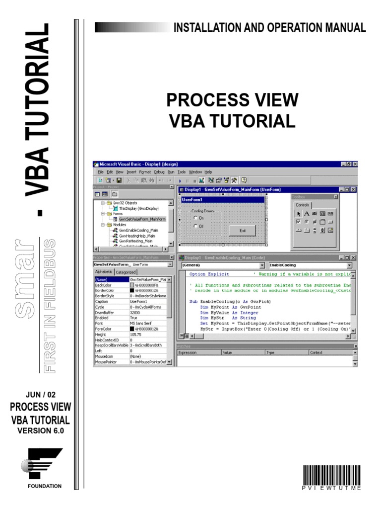 The different topics are divided into three sections: ProcessView Functionality The first section covers the programming environment and the ProcessView functionality that can be used for operations in GraphWorX32, TrendWorX32, AlarmWorX32 or the objects inside one of these applications. Accessing Other Applications The second section covers methods of accessing other applications using OLE Automation. Examples include reporting with Excel, making recipes in Access and sending email. Accessing OPC Data via OLE Automation The third and last section explains how to connect to the Automation DLL of an OPC Server from a VB(A) engine. Many products might have VBA functionality, but only very few besides the SMAR products actually include easy to use OPC capabilities. Therefore an example is included that makes it possible to access OPC data from Excel using the Automation DLL of the OPC Server.