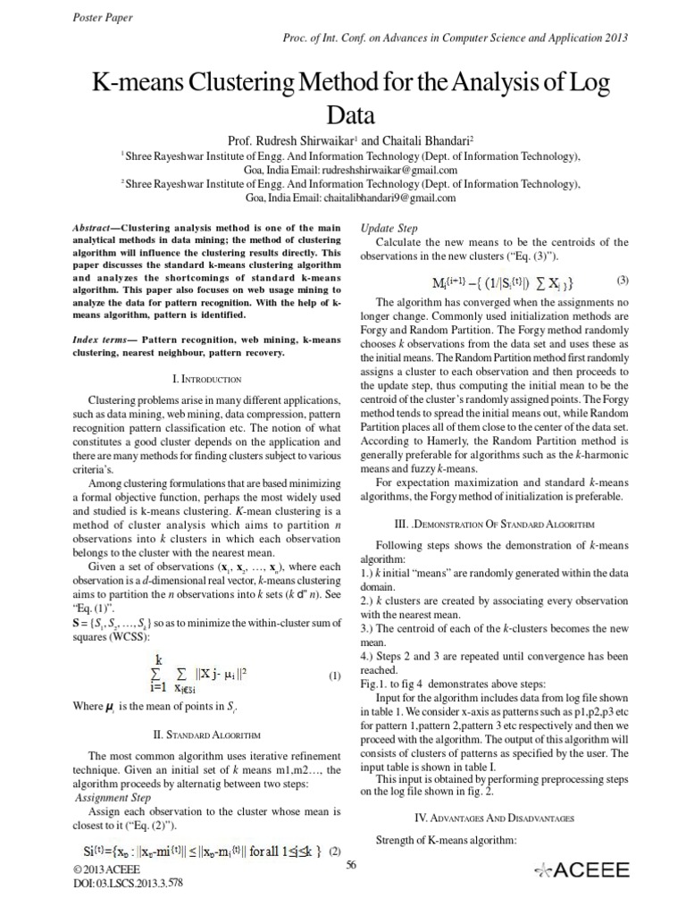 Update Step Calculate the new means to be the centroids of the observations in the new clusters (Eq. (3)). (3) The algorithm has converged when the assignments no longer change. Commonly used initialization methods are Forgy and Random Partition. The Forgy method randomly chooses k observations from the data set and uses these as the initial means. The Random Partition method first randomly assigns a cluster to each observation and then proceeds to the update step, thus computing the initial mean to be the centroid of the clusters randomly assigned points. The Forgy method tends to spread the initial means out, while Random Partition places all of them close to the center of the data set. According to Hamerly, the Random Partition method is generally preferable for algorithms such as the k-harmonic means and fuzzy k-means. For expectation maximization and standard k-means algorithms, the Forgy method of initialization is preferable. III. .DEMONSTRATION OF STANDARD ALGORITHM Following steps shows the demonstration of k-means algorithm: 1.) k initial means are randomly generated within the data domain. 2.) k clusters are created by associating every observation with the nearest mean. 3.) The centroid of each of the k-clusters becomes the new mean. 4.) Steps 2 and 3 are repeated until convergence has been reached. Fig.1. to fig 4 demonstrates above steps: Input for the algorithm includes data from log file shown in table 1. We consider x-axis as patterns such as p1,p2,p3 etc for pattern 1,pattern 2,pattern 3 etc respectively and then we proceed with the algorithm. The output of this algorithm will consists of clusters of patterns as specified by the user. The input table is shown in table I. This input is obtained by performing preprocessing steps on the log file shown in fig. 2. IV. ADVANTAGES AND DISADVANTAGES Strength of K-means algorithm:
