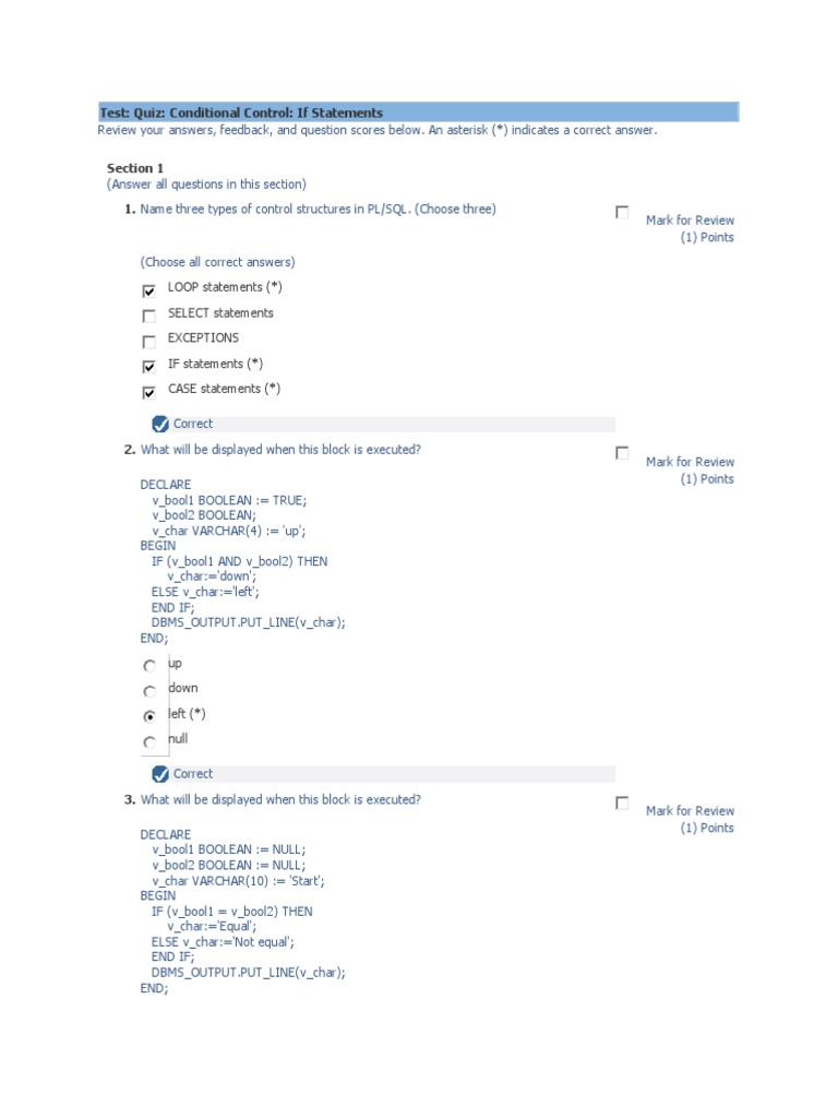 An asterisk (*) indicates a correct answer. Section 1 (Answer all questions in this section) 1. Name three types of control structures in PL/SQL. (Choose three) Mark for Review (1) Points