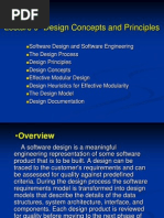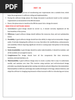 Software engineering: To design, to implement, to test and maintain software. Software engineering tells the methodology to produce software. Soft engineering is a balancing act. Everything will be optimized quality satisfaction of customer. Software engineering processes: i. System engineering. ii. Analysis, design, coding etc. Design is focused for quality. In analysis first we collect requirements then see wither there is Missing requirements Extras requirements Specific requirements Remove wrong requirements Correct the wrong things Design Guidelines: Design should exhibit an architectural structure. A design should be modular; That is, the software should be logically partitioned into elements or subsystems. A design should contain distinct representations of data, architecture, interfaces, and components. A design should lead to structure that are appropriate for the objects to be implemented. A design should lead to component that exhibit independent functional characteristics. A design should lead to interface that reduce the complexity of connections between modules and external environment. A design should be derived using a repeatable method. The design must implement all of the explicit requirements contained in the analysis model, and it must accommodate all of the implicit requirements desired by the customer. The design must be a readable and understandable guide for those who generate code and for those who test and subsequently support the software. The design should provide a complete picture of the software, addressing the data, functional and behavioral domains from an implementation perspective. A design should be represented using a notation that effectively communicates its meaning. A design should exhibit an architecture that - Has been created using recognizable architectural styles or patterns. - Is composed of components that exhibit good design characteristics and. - Can be implemented in an evolutionary fashion. Design principle: The design process should not suffer from tunnel vision. Design should not reinvent the wheel. The design should exhibit uniformity and integration. - Same modules within each component understandable to each. Design should be traceable to the analysis model. - DFD (process within s/w). - ERD (static just like statement). - STD (show structure, different states, observable issues). The design should be structured to accommodate change. Design should degrade (humiliate) gracefully to be handling easily, not hang when giving undesirable words must give message that is not correct. Design should minimize the distance between problem and solution. The design should be reviewed to minimize conceptual (semantic) errors. Design should be accessed for quality. Design is not coding, Coding is not design. The design should be traceable to the analysis model. The design should be structured to accommodate change. Design Concepts: (16/9/2013) 1. Abstraction: Considering a problem at low level of generalization. Tacking our point of interest. Concentrate on the essential features and ignore details that are not relevant. Considering only certain perspectives.