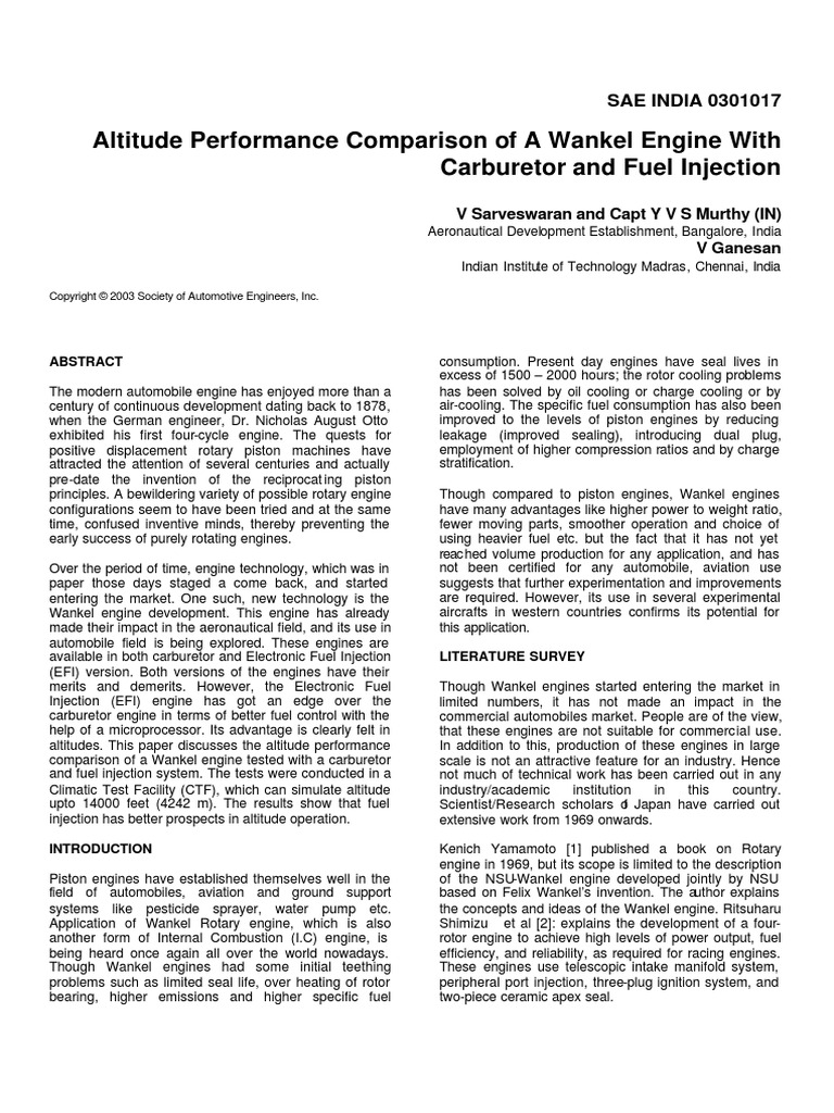 ABSTRACT The modern automobile engine has enjoyed more than a century of continuous development dating back to 1878, when the German engineer, Dr. Nicholas August Otto exhibited his first four-cycle engine. The quests for positive displacement rotary piston machines have attracted the attention of several centuries and actually pre-date the invention of the reciprocat ing piston principles. A bewildering variety of possible rotary engine configurations seem to have been tried and at the same time, confused inventive minds, thereby preventing the early success of purely rotating engines. Over the period of time, engine technology, which was in paper those days staged a come back, and started entering the market. One such, new technology is the Wankel engine development. This engine has already made their impact in the aeronautical field, and its use in automobile field is being explored. These engines are available in both carburetor and Electronic Fuel Injection (EFI) version. Both versions of the engines have their merits and demerits. However, the Electronic Fuel Injection (EFI) engine has got an edge over the carburetor engine in terms of better fuel control with the help of a microprocessor. Its advantage is clearly felt in altitudes. This paper discusses the altitude performance comparison of a Wankel engine tested with a carburetor and fuel injection system. The tests were conducted in a Climatic Test Facility (CTF), which can simulate altitude upto 14000 feet (4242 m). The results show that fuel injection has better prospects in altitude operation. INTRODUCTION Piston engines have established themselves well in the field of automobiles, aviation and ground support systems like pesticide sprayer, water pump etc. Application of Wankel Rotary engine, which is also another form of Internal Combustion (I.C) engine, is being heard once again all over the world nowadays. Though Wankel engines had some initial teething problems such as limited seal life, over heating of rotor bearing, higher emissions and higher specific fuel