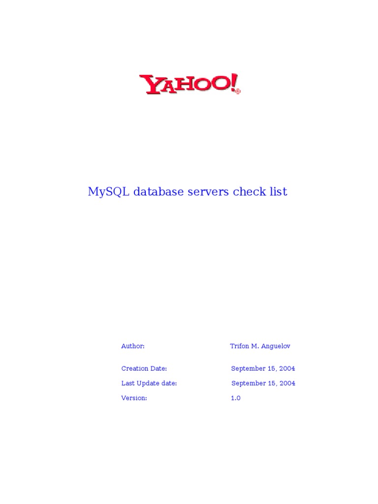 This check list outlines the steps to follo) )hen investigating e*isting MySQL database servers in order to take o)nership of the fro their business o)ners or develop ent tea s. The purpose of this docu ent is to record the status before hanging such achines to D+A group for MySQL database support and to identify the areas of i prove ents.