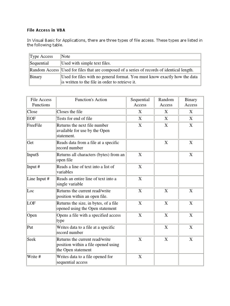 File Access in VBA In Visual Basic for Applications, there are three types of file access.