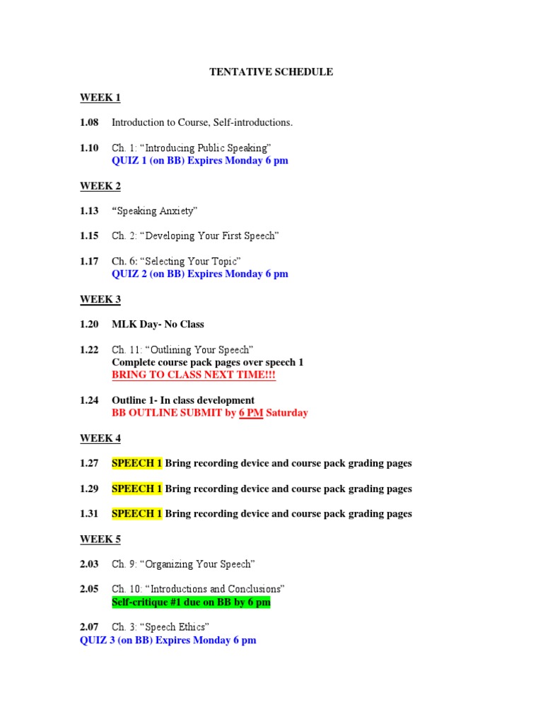 WEEK 3 1.20 1.22 MLK Day- No Class Ch. 11: Outlining Your Speech Complete course pack pages over speech 1 BRING TO CLASS NEXT TIME!!! Outline 1- In class development BB OUTLINE SUBMIT by 6 PM Saturday