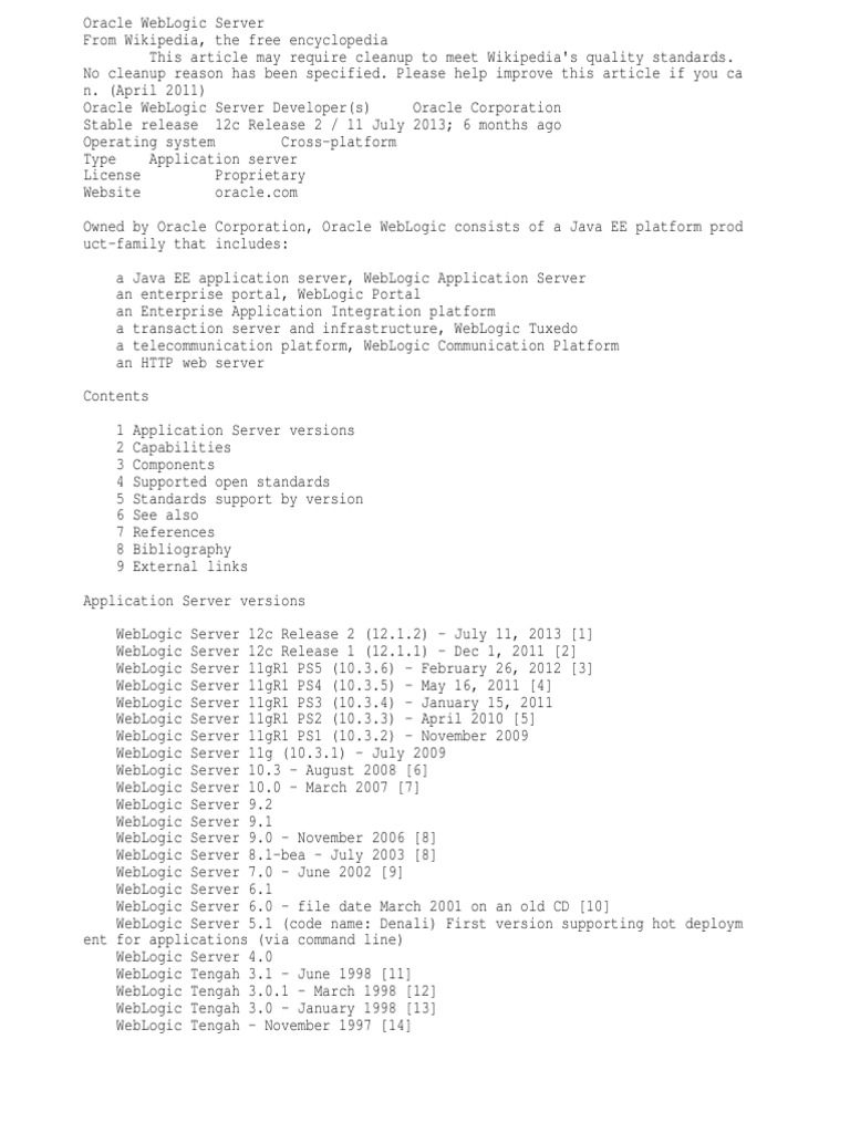 Oracle WebLogic Server From Wikipedia, the free encyclopedia This article may require cleanup to meet Wikipedia's