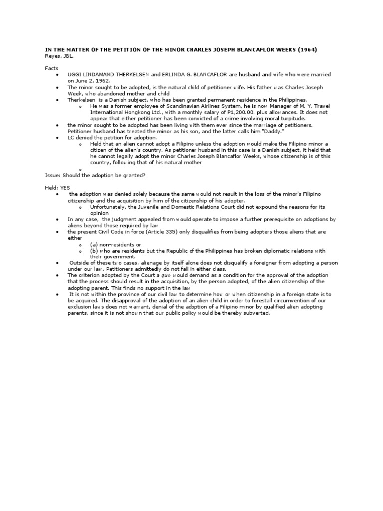 Facts UGGI LINDAMAND THERKELSEN and ERLINDA G. BLANCAFLOR are husband and wife who were married on June 2, 1962. The minor sought to be adopted, is the natural child of petitioner wife. His father was Charles Joseph Week, who abandoned mother and child Therkelsen is a Danish subject, who has been granted permanent residence in the Philippines. o He was a former employee of Scandinavian Airlines System, he is now Manager of M. Y. Travel International Hongkong Ltd., with a monthly salary of P1,200.00. plus allowances. It does not appear that either petitioner has been convicted of a crime involving moral turpitude. the minor sought to be adopted has been living with them ever since the marriage of petitioners. Petitioner husband has treated the minor as his son, and the latter calls him "Daddy." LC denied the petition for adoption. o Held that an alien cannot adopt a Filipino unless the adoption would make the Filipino minor a citizen of the alien's country. As petitioner husband in this case is a Danish subject, it held that he cannot legally adopt the minor Charles Joseph Blancaflor Weeks, whose citizenship is of this country, following that of his natural mother o Should the adoption be granted?