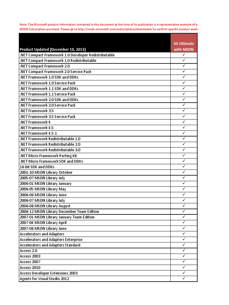 Note: The Microsoft product information contained in this document at the time of its publication is a representative example of products offered through MSDN Subscription levels. It may not accurately reflect all the products available at the time of your MSDN Subscription purchase. Please go to http://msdn.microsoft.com/subscriptions/downloads/ to confirm specific product availability.