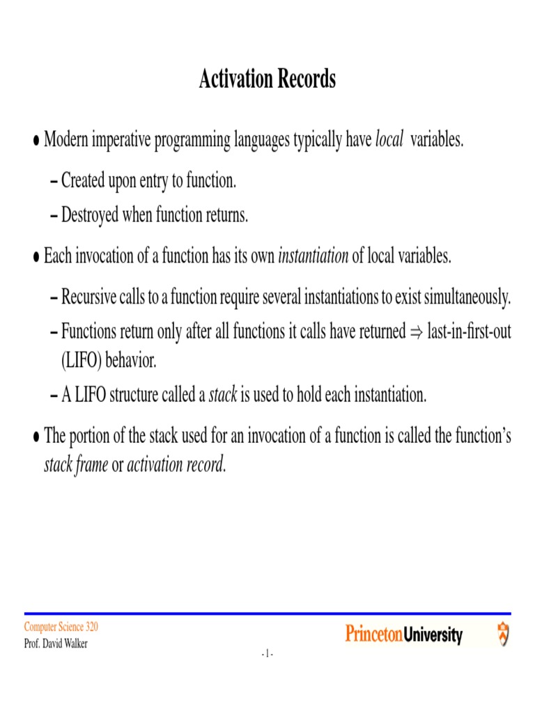 Can have multiple stack frames for same function (different invocations) on stack at any given time due to recursion. Consider: let function fact(n:int):int = if n = 0 then 1 else n * fact(n - 1) in fact(3) end Step 1: Record for fact(3) pushed on stack. Stack Frame n=3 for fact