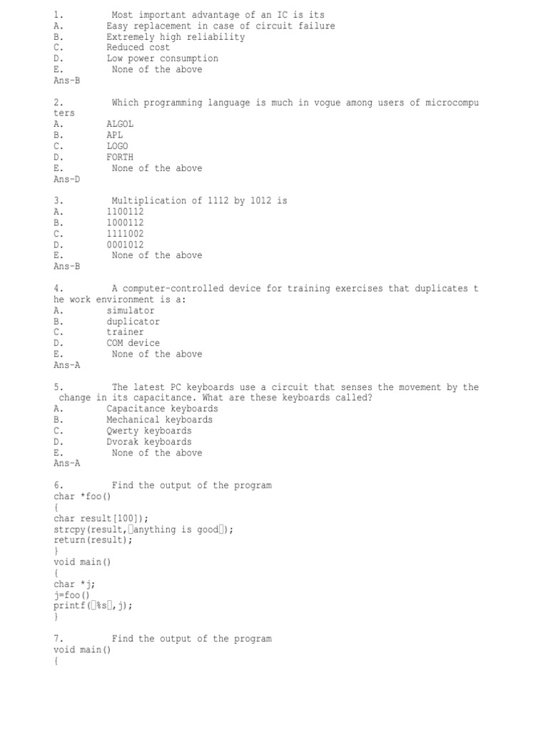 4. A computer-controlled device for training exercises that duplicates t he work environment is a: A. simulator B. duplicator C. trainer D. COM device E. None of the above Ans-A 5. The latest PC keyboards use a circuit that senses the movement by the change in its capacitance. What are these keyboards called? A. Capacitance keyboards B. Mechanical keyboards C. Qwerty keyboards D. Dvorak keyboards E. None of the above Ans-A 6. Find the output of the program char *foo() { char result[100]); strcpy(result, anything is good ); return(result); } void main() { char *j; j=foo() printf( %s ,j); } 7. Find the output of the program void main() {