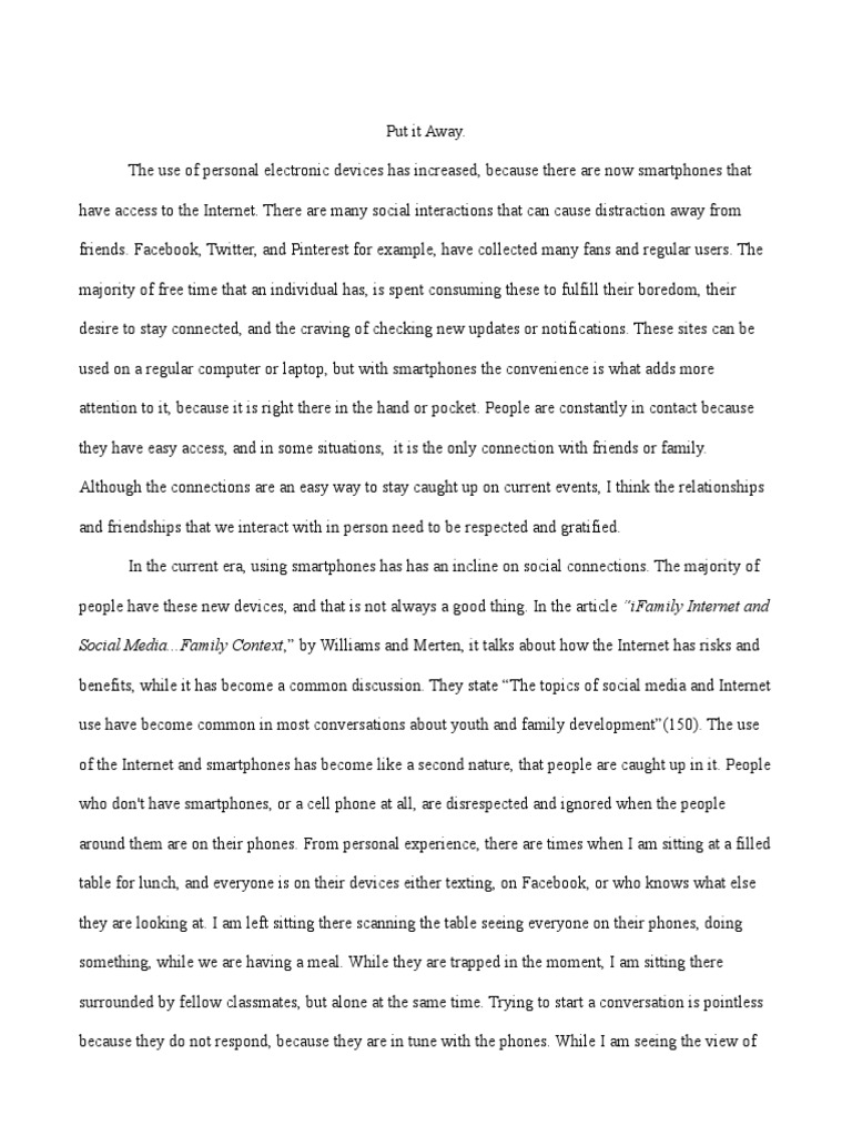 The use of personal electronic devices has increased, because there are now smartphones that have access to the Internet. There are many social interactions that can cause distraction away from friends. Facebook, Twitter, and Pinterest for example, have collected many fans and regular users. The ma ority of free time that an individual has, is spent consuming these to fulfill their boredom, their desire to stay connected, and the craving of checking new updates or notifications. These sites can be used on a regular computer or laptop, but with smartphones the convenience is what adds more attention to it, because it is right there in the hand or pocket. People are constantly in contact because they have easy access, and in some situations, it is the only connection with friends or family. Although the connections are an easy way to stay caught up on current events, I think the relationships and friendships that we interact with in person need to be respected and gratified. In the current era, using smartphones has has an incline on social connections. The ma ority of people have these new devices, and that is not always a good thing. In the article iFamily Internet and Social Media...Family Context,! by "illiams and #erten, it talks about how the Internet has risks and benefits, while it has become a common discussion. They state $The topics of social media and Internet use have become common in most conversations about youth and family development!%&'(). The use of the Internet and smartphones has become like a second nature, that people are caught up in it. People who don*t have smartphones, or a cell phone at all, are disrespected and ignored when the people around them are on their phones. From personal experience, there are times when I am sitting at a filled table for lunch, and everyone is on their devices either texting, on Facebook, or who knows what else they are looking at. I am left sitting there scanning the table seeing everyone on their phones, doing something, while we are having a meal. "hile they are trapped in the moment, I am sitting there surrounded by fellow classmates, but alone at the same time. Trying to start a conversation is pointless because they do not respond, because they are in tune with the phones. "hile I am seeing the view of