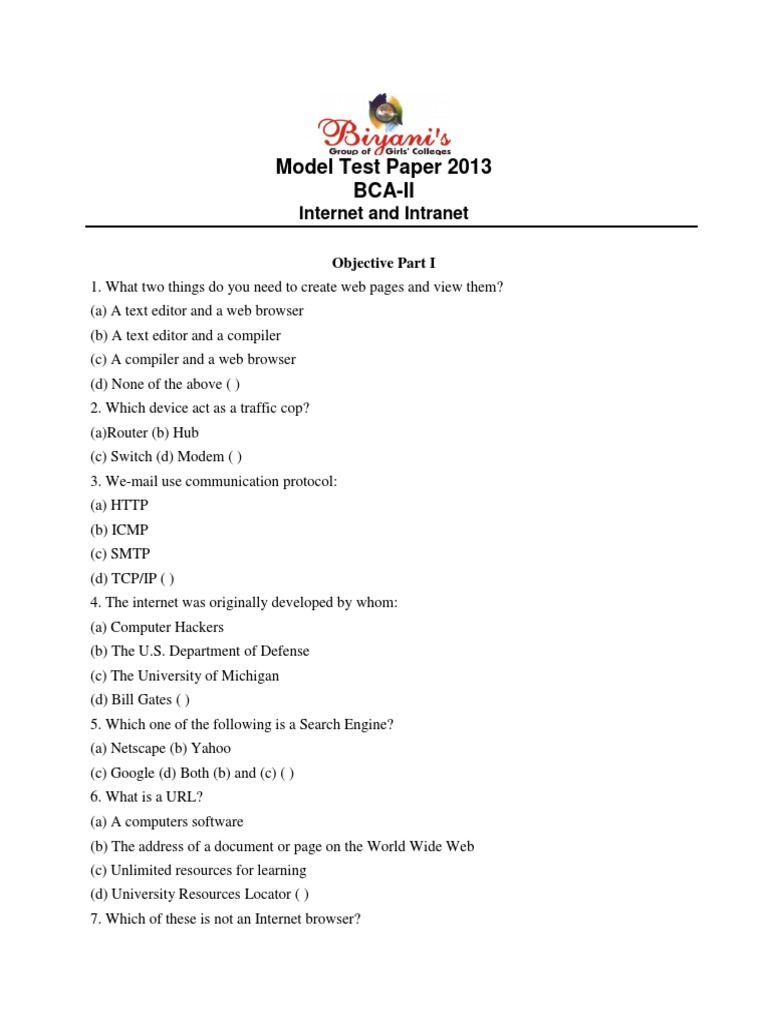 Objective Part I 1. What two things do you need to create web pages and view them? (a) A text editor and a web browser (b) A text editor and a compiler (c) A compiler and a web browser (d) None of the above ( ) 2. Which device act as a traffic cop? (a)Router (b) Hub (c) Switch (d) Modem ( ) 3. We-mail use communication protocol: (a) HTTP (b) ICMP (c) SMTP (d) TCP/IP ( ) 4. The internet was originally developed by whom: (a) Computer Hackers (b) The U.S. Department of Defense (c) The University of Michigan (d) Bill Gates ( ) 5. Which one of the following is a Search Engine? (a) Netscape (b) Yahoo (c) Google (d) Both (b) and (c) ( ) 6. What is a URL? (a) A computers software (b) The address of a document or page on the World Wide Web (c) Unlimited resources for learning (d) University Resources Locator ( ) 7. Which of these is not an Internet browser?
