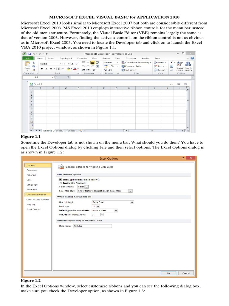 Figure 1.1 Sometime the Developer tab is not shown on the menu bar. What should you do then? You have to open the Excel Options dialog by clicking File and then select options. The Excel Options dialog is as shown in Figure 1.2:
