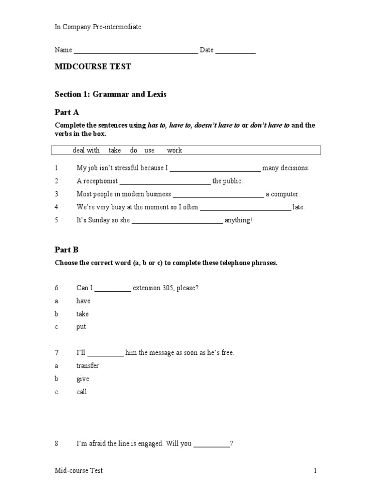 MIDCOURSE TEST Section 1: Grammar and Lexis Part A