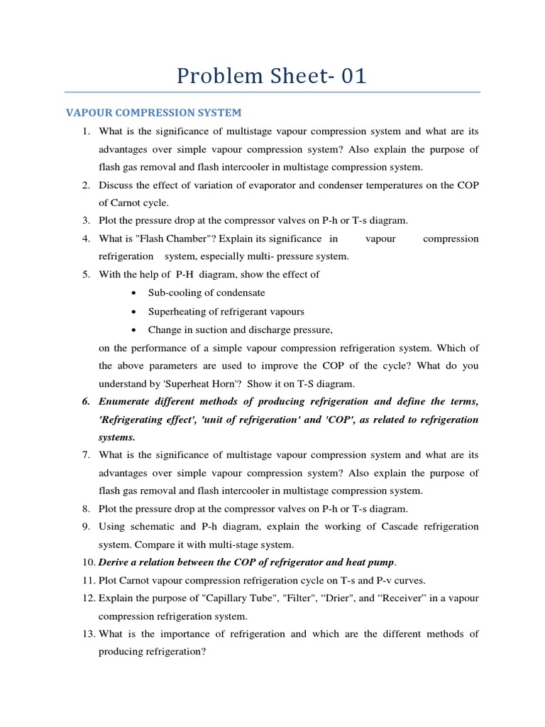 1. What is the significance of multistage vapour compression system and what are its advantages over simple vapour compression system? Also explain the purpose of flash gas removal and flash intercooler in multistage compression system. 2. Discuss the effect of variation of evaporator and condenser temperatures on the COP of Carnot cycle. 3. Plot the pressure drop at the compressor valves on P-h or T-s diagram. 4. What is "Flash Chamber"? Explain its significance in refrigeration system, especially multi pressure system. vapour compression