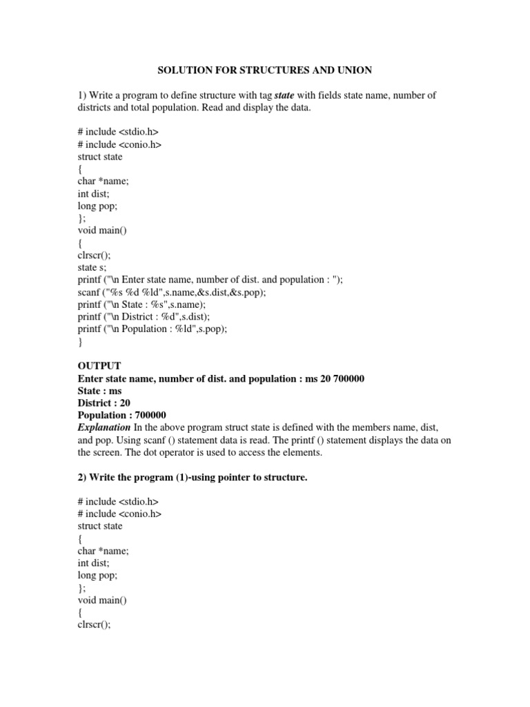 SOLUTION FOR STRUCTURES AND UNION 1) Write a program to define structure with tag state with fields state