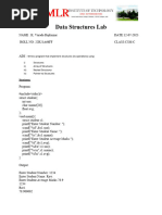 printf ("\n Total colleges : %d",r[x].total); } OUTPUT State : MS Engineering Colleges : 200 Medical Colleges : 100 Management Colleges : 150 Universities : 20 Total : 470 State : AP Engineering Colleges : 150 Medical Colleges : 175 Management Colleges : 125 Universities: 15 Total : 465 State having maximum colleges State : MS Engineering Colleges : 200 Medical Colleges : 100 Management Colleges : 150 Universities : 20 Total colleges : 470 Explanation The logic of the above program is same as last one. Here, only one value is compared out of two records. 9) Write a program to check status of the printer using int86() function. The details are as per given below. a) Interrupt - 0x17 b) Inputs - AH = 0x02 - DX = printer port number (0=LPT1, 1=LPT2, 2=LPT3) c) Returns - AH = Completion / nonsuccess code Completion values are Bit 0=1 : time out Bit 3=1 : I/O mistake Bit 4=1 : Printer selected Bit 5=1 : Out of paper Bit 6=1 : Printer acknowledge Bit 7=1 : Printer not engaged # include <stdio.h> # include <conio.h> # include <dos.h> void main () { union REGS in,out; clrscr(); in.h.ah=2;
