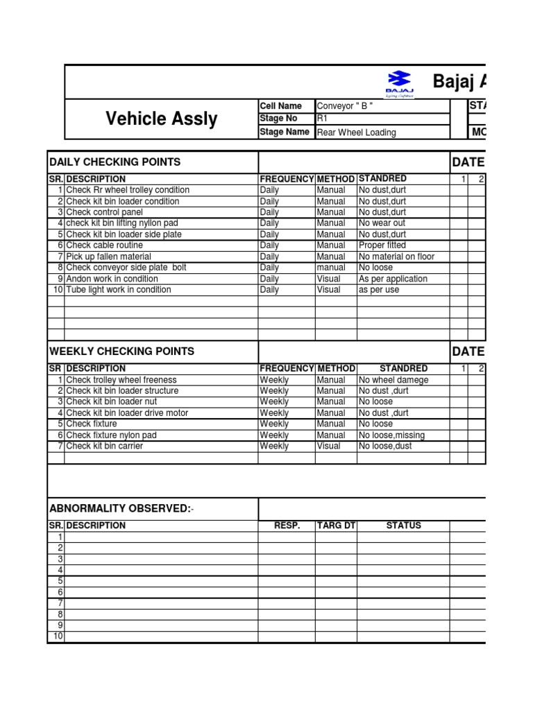 SR. 1 2 3 4 5 6 7 8 9 10 DESCRIPTION Check Rr wheel trolley condition Check kit bin loader condition Check control panel check kit bin lifting nyllon pad Check kit bin loader side plate Check cable routine Pick up fallen material Check conveyor side plate bolt Andon work in condition Tube light work in condition FREQUENCY METHOD Daily Manual Daily Manual Daily Manual Daily Manual Daily Manual Daily Manual Daily Manual Daily manual Daily Visual Daily Visual STANDRED No dust,durt No dust,durt No dust,durt No wear out No dust,durt Proper fitted No material on floor No loose As per application as per use Cell Name Stage No Conveyor " B " R1 Stage Name Rear Wheel Loading
