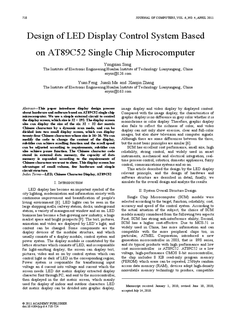 [11] Hou Liling. LED dot matrix display control system Based on AT89S52[J]. Journal of Zhangzhou Technical Institute. 2008, 10(3):70-72. Yongxian Song was born in xuzhou,on April 1,1975. He received the B.S. degree in Applied Electronic Technology from Huaihai Institute of Technology, Lianyungang,China, in 1997, and the M.S degree in Control Theory and Control Engineering from Jiangsu University, Zhenjiang, China , in 2006. From 2009 to now, He is studing for Ph.D degree in Control Theory and Control Engineering from Jiangsu university, Zhenjiang, China. Since 2006, he has beeen a teacher in Huaihai Institute of Technology, Lianyungang,China. His current research interests include signal processing ,intelligent control, and industrial control . Yuan Feng. was born in lianyungang ,on March 28,1978. He received the B.S. degree in Computer hardware and application from Huaihai Institute of Technology, Lianyungang, China, in 1999. and the M.S degree in Industrial Control from Nanjing University of Science, Nanjing, China, in 2007. From 1999 to now, he has beeen a teacher in Huaihai Institute of Technology, Lianyungang,China. His current research interests include signal processing, Computer Control Technology