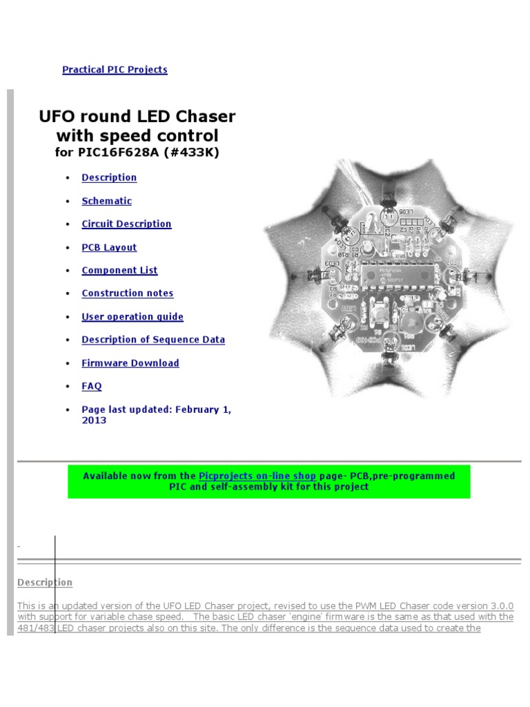 Description This is an updated version of the UFO LED Chaser project, revised to use the PWM LED Chaser code version 3.0.0 with support for variable chase speed. The basic LED chaser 'engine' firmware is the same as that used with the 481/483 LED chaser projects also on this site. The only difference is the sequence data used to create the
