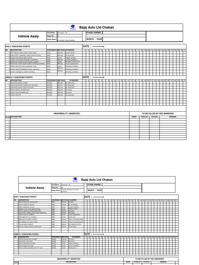 SR. DESCRIPTION 1 Check fastners trolley 2 Pick up fallen material 3 4 5 6 7 8 9 10 Check conv side bolt Andon work in condition Tube light work in condition Maximum & minimum inventory in secondary