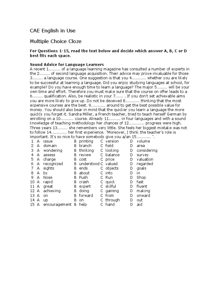 CAE English in Use Multiple Choice Cloze